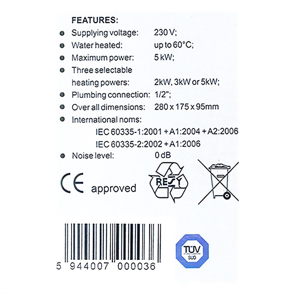 - Maximum power: 5000 W