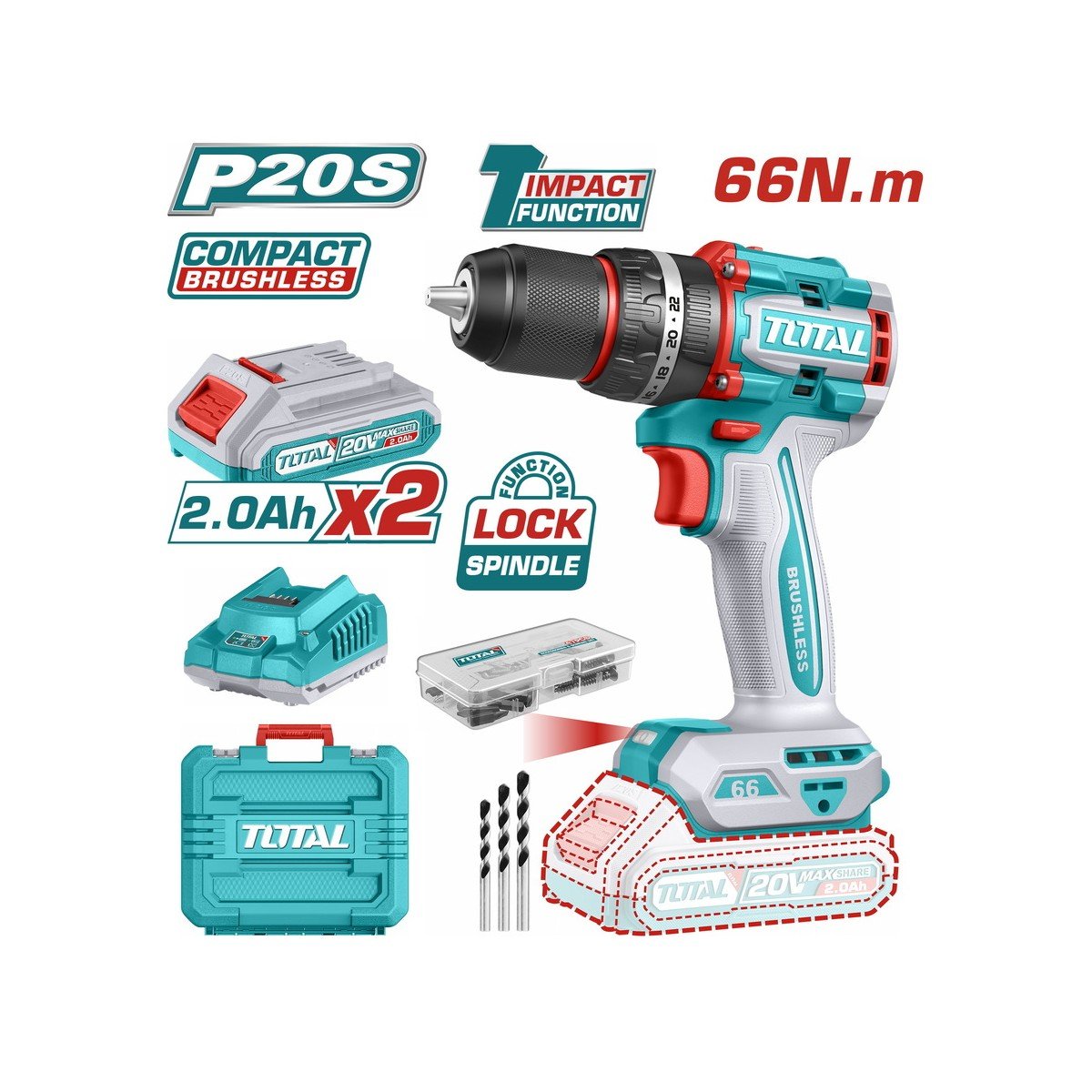 TOTAL ΕΠΑΓΓ. ΔΡΑΠΑΝΟΚΑΤΣΑΒΙΔΟ ΚΡΟΥΣΤΙΚΟ ΜΠΑΤ. Li-ion 20V / 2Ah / 66Nm / 2 ΜΠΑΤ BL Motor (TIDLI20668E)
