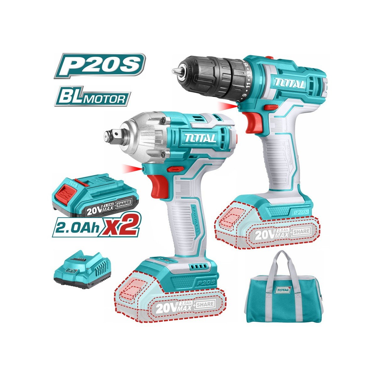 TOTAL ΣΕΤ ΔΡΑΠΑΝΟΚΑΤΣΑΒΙΔΟ + ΜΠΟΥΛΟΝΟΚΛΕΙΔΟ ΜΠΑΤ. Li-ion 20V / 2Ah / 2 ΜΠΑΤ